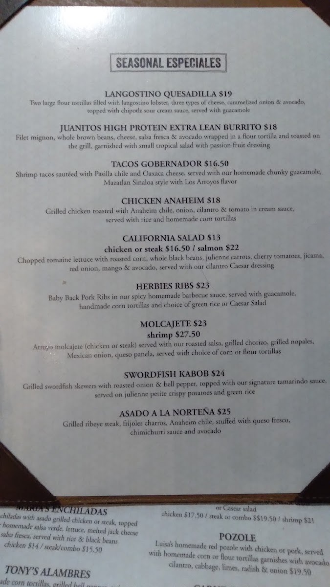 6 oz. New York steak on top of grilled Anaheim Chile stuffed with Mexican cheese, served with Mexican rice, beans, baby grilled onions, guacamole and homemade corn or flour tortillas.